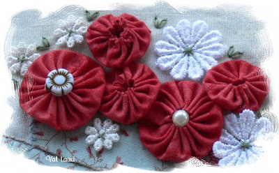 I had so much enjoyment putting this design together.  It embodies so many things that I like - applique, Suffolk Puffs, embroidery, lace, beads and pretty rosebuds.