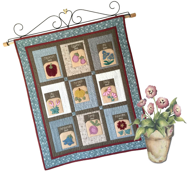 It has seven mini quilts for the days of the week, twelve for the numbers and a heart month indicator A fabric covered box keeps all the spare bits and pieces in order. The garden elements consist of simple applique, stitching and Suffolk Puffs. A Prairie Point border completes the dream.